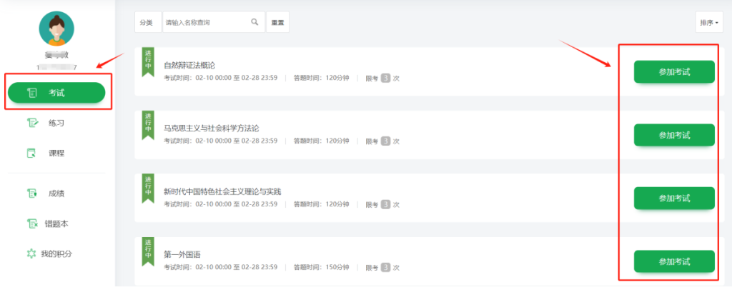 2.1 考生进入考生中心后点击左侧“考试”,选择相应科目点击右侧“参加考试”即可进入考试。
